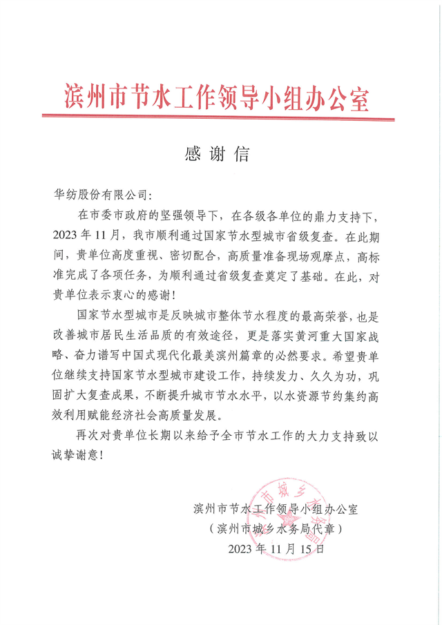 導(dǎo)讀:近日,濱州市節(jié)水工作領(lǐng)導(dǎo)小組辦公室向公司發(fā)來一封感謝信,