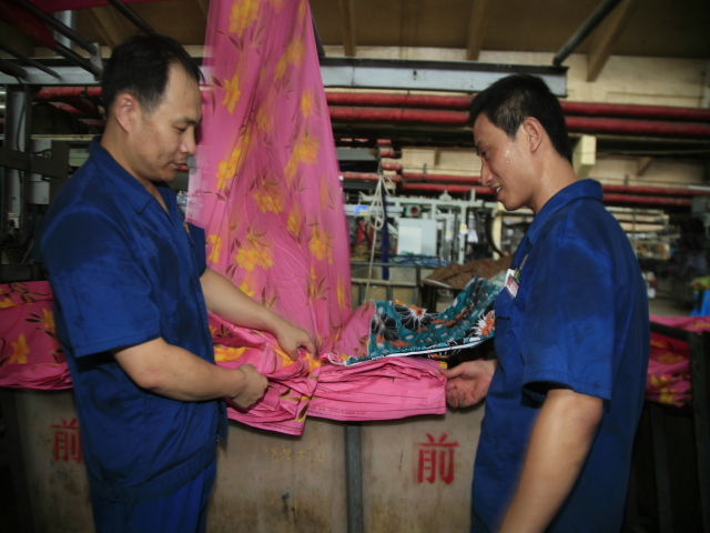 家紡車間前處理340絲光機出檢工李娟(圖左)與前來推布的360拉幅機進檢工朱濤交接產品。李娟說:“天氣越熱,我們越要互相提示,注重細節,保證安全,保證品質。”