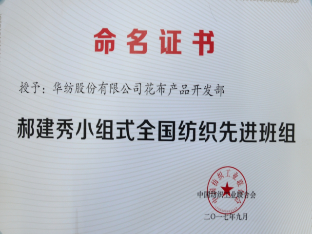導(dǎo)讀:公司花布產(chǎn)品設(shè)計(jì)開(kāi)發(fā)部榮獲郝建秀小組式全國(guó)紡織先進(jìn)班組。